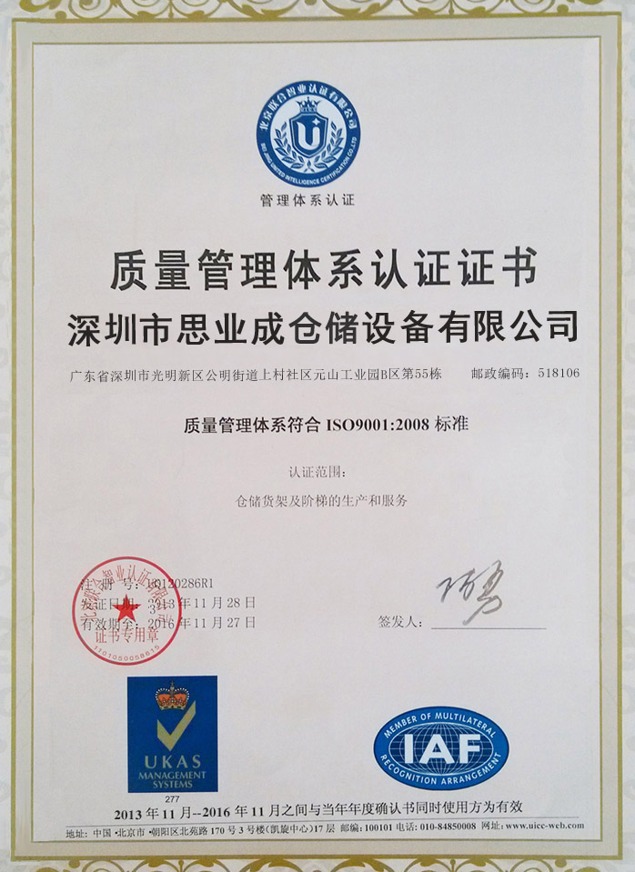 质理管理体系认证证书