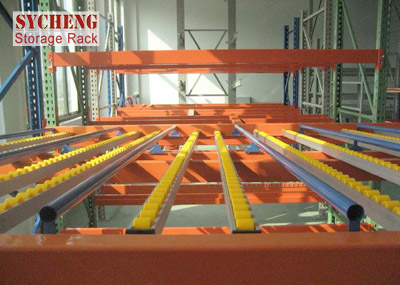 一、货架每层前后横梁之间设置滚轮式铝合金或钣金流力条